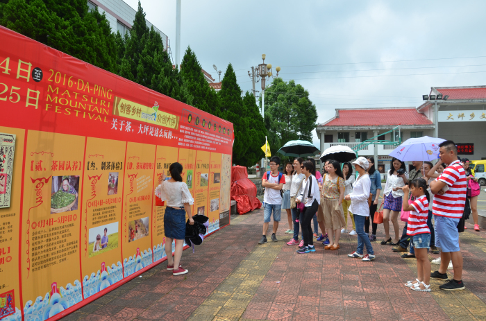 “茶叶淡淡的香味好清新。” 一下车,大家就被茶香吸引,纷纷挤到铺满茶叶的广场。广场展板前,当地导游绘声绘色地介绍起旅游路线和特色活动。