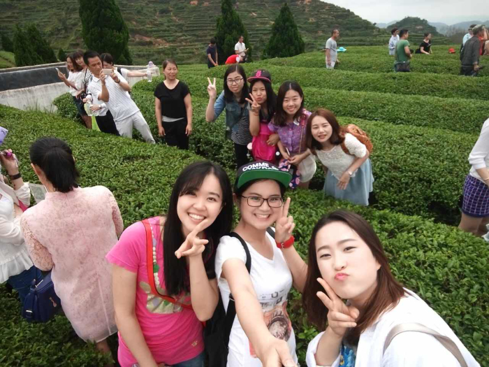 看到绿油油的大片茶海,所有人都喜笑颜开,展开双臂,拥抱大自然,沉浸在浓郁的茶文化氛围里。