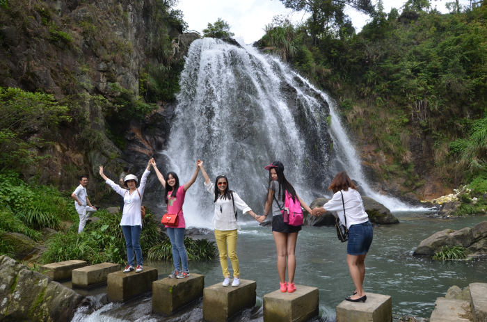 遮头溪瀑布的溪水顺着悬崖峭壁飞流斜下、珠花四溅,在如画的瀑布下,女神们展露如画的笑靥,感受春日的一抹清凉。