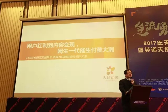 论坛的最后,天风证券传媒互联网首席分析师文浩发表了主题演讲——2017年传媒互联网行业投资思路。他认为传媒互联网从长期来看,未来三五年仍然是朝阳行业,并从消费转型、人口结构变化和中产阶级三方面展开了论述。