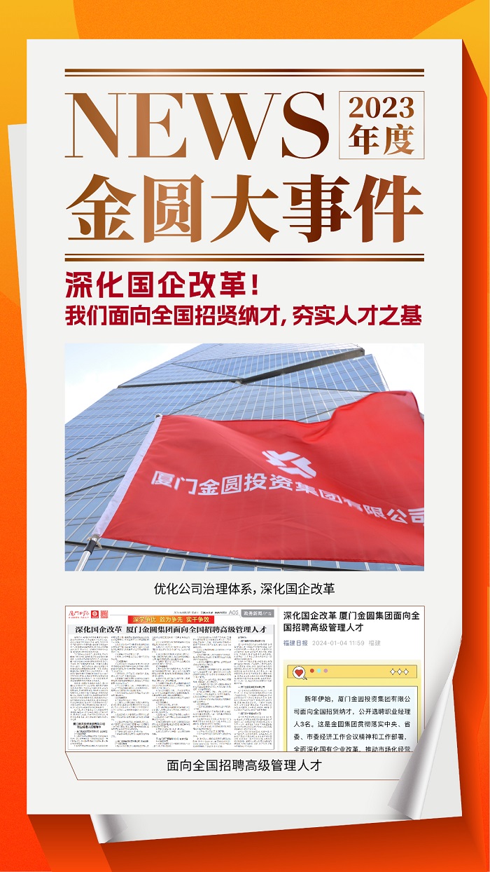 2023年,金圆集团全面深化国有企业改革,进一步优化公司治理体系,厘清权责,提升管理,全面推行经理层任期制和契约化管理,试点开展竞争上岗,并面向全国招聘集团副总经理及子公司高管,推动各业务条线交流轮岗,完善市场化考核激励机制,为集团高质量发展、助力金融强市建设夯实人才之基。