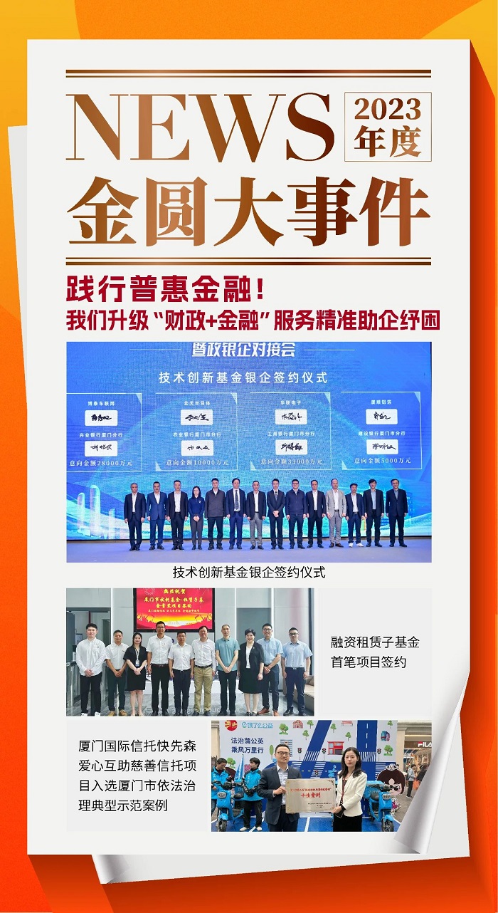 2023年,在市财政局指导下,金圆集团发挥综合金融服务优势,打造“财政政策 金融工具”升级版。技术创新基金规模扩至300亿元,新设30亿元融资租赁子基金;增信基金新设10亿元首贷续贷专项增信子基金;应急还贷资金、纾困基金、厦门市供应链协作基金等普惠金融覆盖面不断扩大,相关服务案例入选《国家产融合作试点城市典型案例集(2023年)》。“信易贷”厦门样板获全国推广。