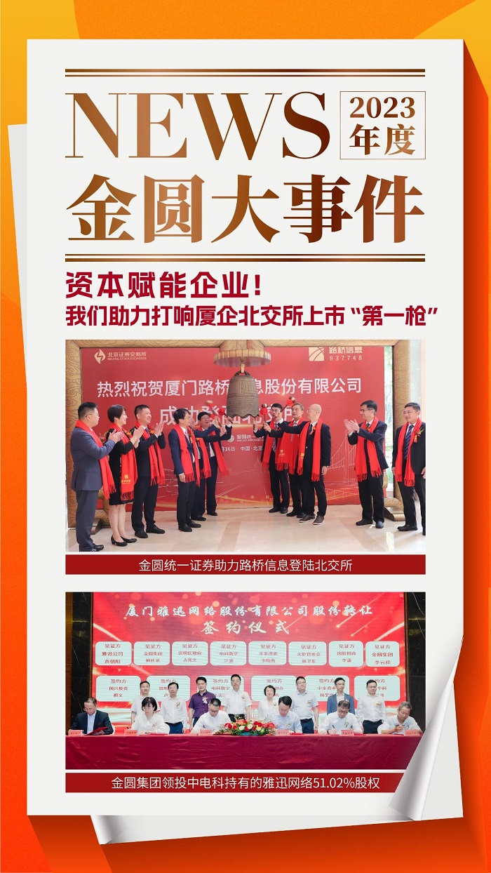2023年8月,由金圆统一证券承销保荐的厦门路桥信息股份有限公司正式登陆北交所,打响厦门企业北交所上市的第一枪,书写以资本市场服务助力企业高质量发展的成功案例。金圆集团领投中电科持有的雅迅网络51.02%股权,助力我市新能源、新型显示产业优化升级。