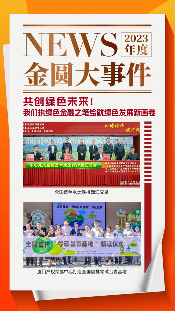 2023年,金圆集团丰富绿色金融服务“工具箱”,成功发行福建省首单绿色科创公司债。厦门产权交易中心完成全国首单水土保持碳汇交易,助力打造国内首批“零碳台青基地”,推动首批“闽宁协作”农业碳汇交易落地,“厦绿融”数字化金融服务平台入库绿色企业及项目230家,相关绿色金融创新举措获得最高人民检察院、国家发改委、国家生态环境部、人民银行总行等肯定。