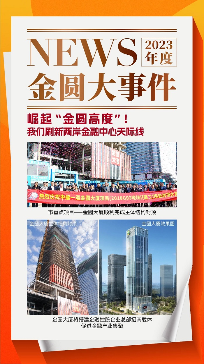 2023年12月27日,由金圆集团投资建设的市重点项目——金圆大厦顺利完成主体结构封顶。金圆大厦位于厦门两岸金融中心核心启动区,项目总建筑面积117904㎡,建筑总高度215.6米,将打造集金融、科技、生态于一体的超高层商务楼宇新标杆和两岸金融中心片区新地标,搭建金融控股企业总部招商载体,促进金融产业集聚,服务全市招商大局。