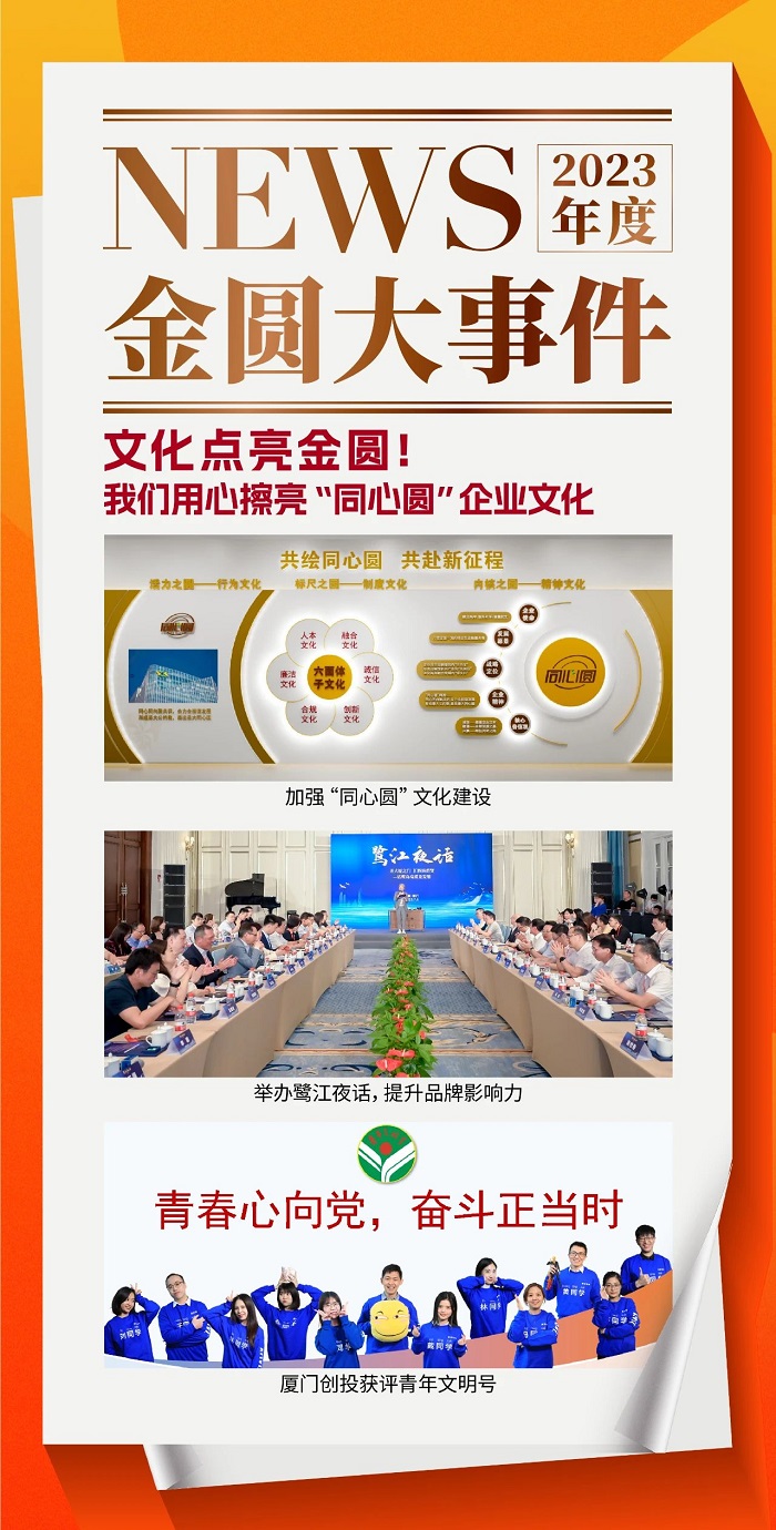 2023年,金圆集团加大“同心圆”文化建设,着力打造有金圆特色的金融文化体系,开展“文化点亮金圆”行动,以文化内聚人心、外塑形象。连续五年独家合作支持中国电影金鸡奖“金圆·点亮金鸡”,举办海峡金融论坛、母基金峰会·鹭江创投论坛、鹭江夜话等活动,厦门创投获评“全国青年文明号”,品牌影响力持续提升。
