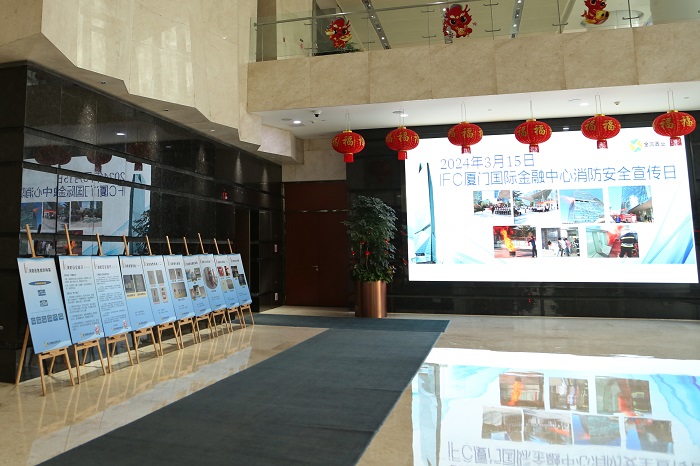 厦门国际金融中心一楼设置宣传展位,向员工住户普及消防安全知识。