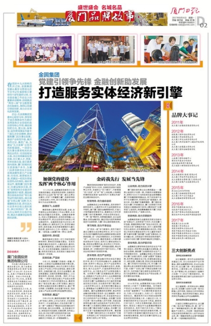 金圆集团发挥金融支持实体经济建设的作用,致力于在两岸金融合作、金融改革创新、扶持中小微企业、新兴产业投资等方面先行先试,综合运用金融专业技术,做强、做优、做大企业资产,打造独具特色的地方金控平台,全力服务全市产业转型战略大局。近年累计为厦门区域基础设施、国有企业、战略新兴产业和众多中小企业等提供超过数百亿元的融资支持。8月17日,由思明区政府与厦门金圆集团合作打造的思明基金空间正式启动,这也是我市首个真正意义上由政府牵头设立,旨在服务辖区基金企业、增强基金行业集聚效应的交流平台和活动基地。翻开金圆集团的成绩单,像这样的金融创新举措还有很多:设立福建第一家中外合资股权投资基金公司、在全省率先设立百亿级的政府产业引导基金、实现厦门自贸片区第一笔对台跨境人民币贷款、发起全国首单轨道交通行业的绿色资产证券化项目、携手厦门火炬高新区管委会和台湾联电发起设立厦门集成电路产业基金、完成厦门自贸片区首个船舶融资租赁项目等。集团旗下的厦门国际信托近三年连续在“中国优秀信托公司”评选活动中获“最具区域影响力信托公司”称号。