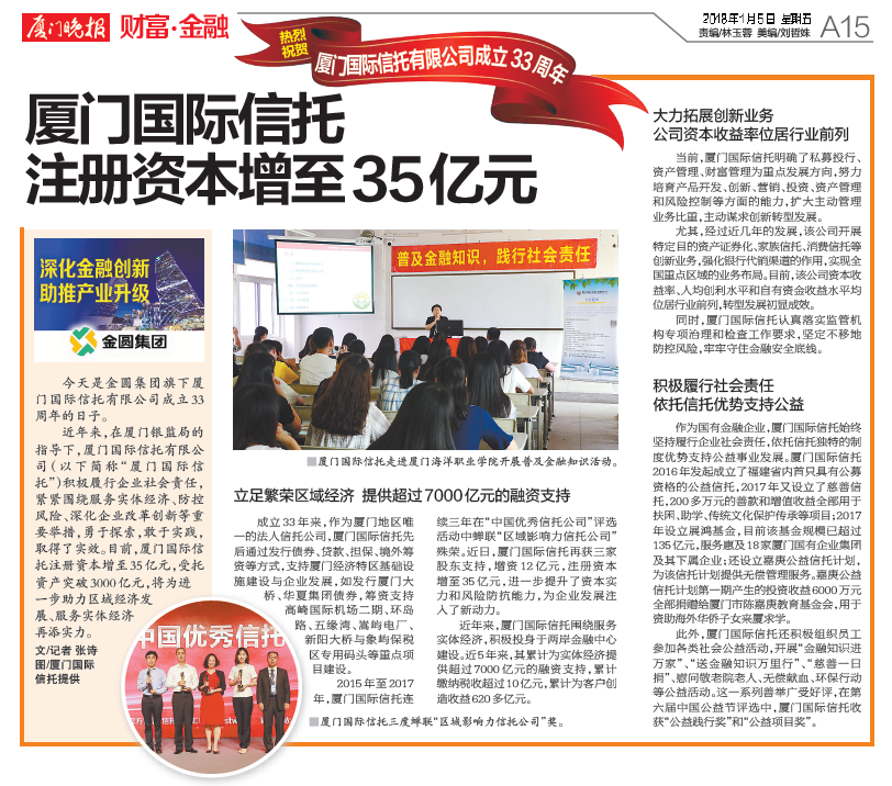 2018年1月5日是金圆集团旗下厦门国际信托有限公司成立33周年的日子。