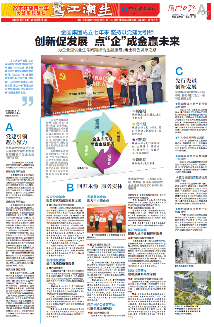 金圆集团以市委巡察为契机,从源头抓起,强制度,重执行,促发展,以从严治党引领从严治企向纵深发展,构建起更加完善的管理体系,党员的“四个意识”“四个自信”得到进一步提升。在党建引领下,集团党委不断激发党员干部在两岸金融合作、金融改革创新、扶持中小微企业、新兴产业投资等重点项目上迎难而上、开拓进取,主动服务厦门千亿产业链群和千亿投资工程。仅去年至今,一个个先行先试的改革创新创举不断涌现:成立国家信用大数据创新中心首家金融应用公司、推动集成电路产业投资基金——联和基金落地厦门、引入中金系列基金项目落地厦门、获批筹建首家两岸合资消费金融公司——厦门金美信消费金融有限责任公司、公开竞得福建省首宗租赁住房项目用地等,金圆集团的政治优势正逐渐转化为企业的核心竞争力,将“创特色、当先锋、促发展”落到了实处。