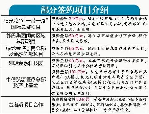 其中,湖里区政府和两岸金融中心指挥部分别与阳光控股有限公司、郭氏集团签订阳光龙净“一带一路”国际总部项目和郭氏集团闽南区域总部项目合作协议,总投资金额分别为30亿元和50亿元;两岸金融中心指挥部和绿地集团签订绿地东南总部及金融总部项目合作协议,项目投资额90亿元;思明区政府与启迪金控投资有限公司签订思明金融科技园项目合作协议,投资金额为40亿元;金圆集团与北京弘慈医疗、中信产业基金、东和荣基基金签订合作协议,投资额130亿元;翔安区政府、金圆集团与普洛斯集团签订合作协议,投资金额为50亿元。以上合作项目合计投资金额达到390亿元。