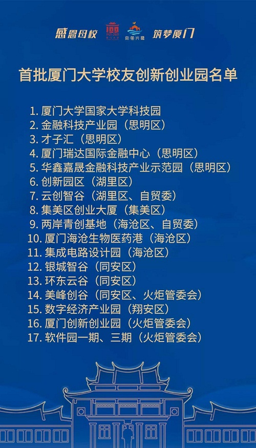 市校企三方携手,打造校友创新创业集聚区,做大做强校友经济。厦门将集中精力扶持做强一批“厦门大学校友创新创业园”载体,首批总共推出17个园区,遍布全市六个行政区。符合条件的入园企业可享受相应园区的补贴、落户奖励、购房补贴、企业税收及个人所得税返还、子女就学保障等相关政策(具体以各园区支持政策为准),为厦大校友在厦发展提供优质贴心、便利周到的创新创业空间和服务。