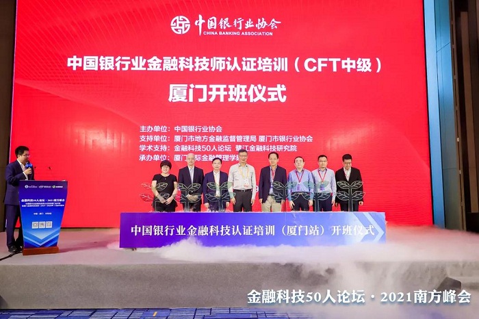中国银行业金融科技认证培训(厦门站)正式开班。中国互联网金融协会区块链研究工作组组长、中国银行原行长、cft50学术顾问李礼辉,中国银行业协会首席信息官、cft50学术成员高峰,厦门金圆集团党委书记、董事长檀庄龙,国家金融与发展实验室副主任、厦门鹭江金融科技研究院院长、cft50学术委员杨涛,厦门市地方金融监督管理局副局长连任,中诚信投资集团首席执行官、中国金融学会绿色金融专委会副主任马险峰,中国人民大学国家发展与战略研究院院长助理、cft50青年成员宋鹭,厦门市银行业协会秘书长陈晓清共同为培训班揭牌。