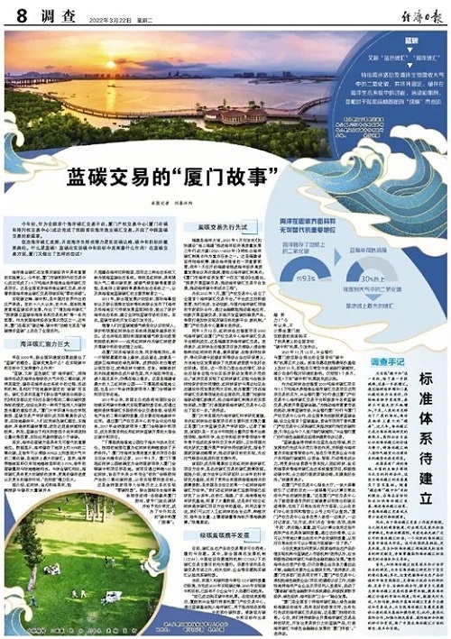 3月22日,经济日报刊发文章《蓝碳交易的“厦门故事”》,文中多次提到金圆集团旗下厦门产权交易中心助力厦门蓝碳交易案例。