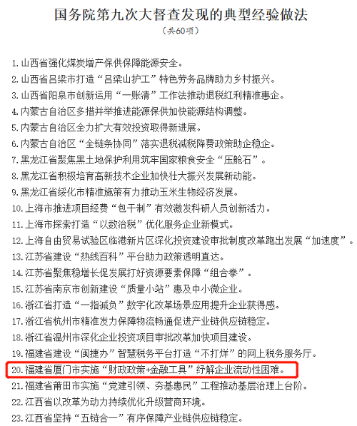 国务院办公厅9月27日印发通报对国务院第九次大督查发现的典型经验做法给予表扬,福建省厦门市实施“财政政策 金融工具”纾解企业流动性困难的做法名列其中。