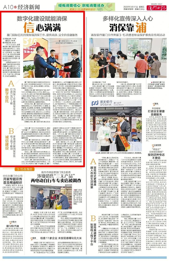 消费者权益保护工作是厦门国际信托始终坚持的重要社会责任之一。近年来,厦门国际信托在加强消保宣传的同时,持续推动数字化建设赋能消保工作,为客户送上更加高效、安全的金融服务。