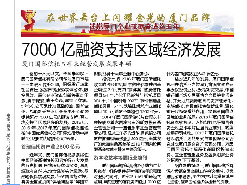 刊于2017年11月3日《海峡导报》 7000亿融资支持区域经济发展 厦门国际信...