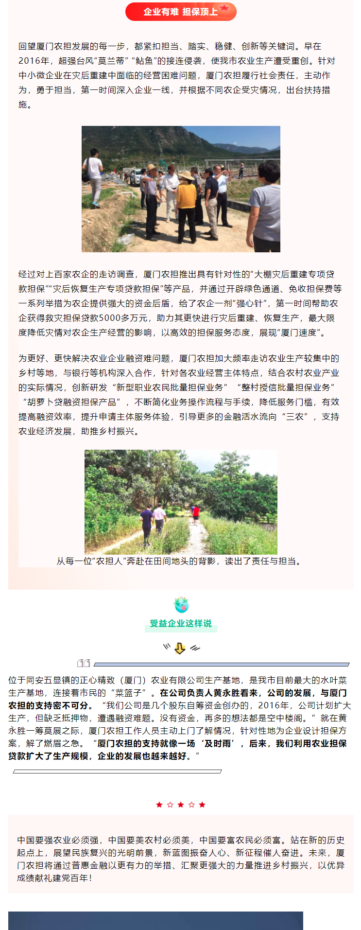 上一篇:助力乡村振兴 | 厦门农担落地首批 “整村授信”批量担保业务