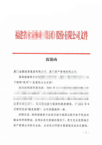 近日,金圆集团旗下厦门资产管理有限公司(以下简称厦门资管)收到深圳证券交易所某上市公司的致谢函,致谢函对金圆集团、厦门资管在服务实体经济、防范化解金融风险、助力企业纾困盘活表示感谢。