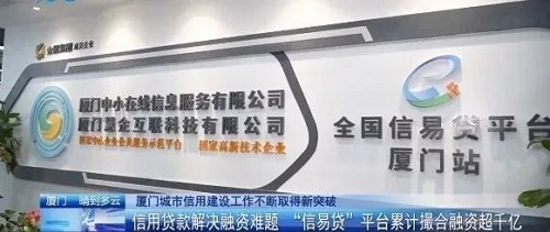 9月10日,厦视新闻头条播发“喜迎党的二十大”系列报道之《厦门城市信用建设工作不断取得新突破:7月信用指数全国第一》,其中,着重报道了金圆集团厦门中小在线建设运营的厦门市信易贷平台(厦门市首贷续贷服务中心)的总体成效。