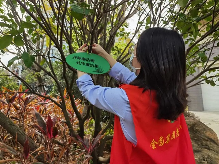 在有条不紊、干劲十足的劳作之后,集团纪检干部和青年团员将廉政寄语卡片挂上树枝,植廉于心,倡廉于行,金圆人以实际行动营造廉洁文化氛围、守护国企政治生态的“绿水青山”。