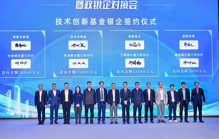 技术创新基金银企签约仪式上, 云天半导体与农业银行厦门市分行、博泰车联网与兴业银行厦门分行、华联电子与工商银行厦门市分行、厦顺铝箔与建设银行厦门市分行分别签订合作协议。