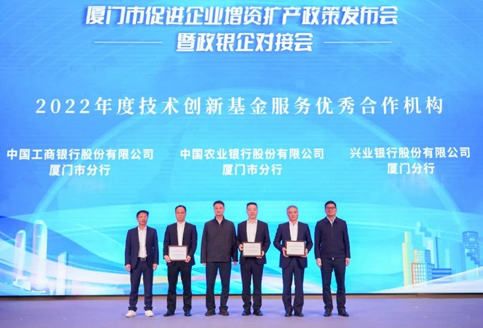 农业银行厦门市分行、兴业银行厦门分行、工商银行厦门市分行获评2022年度技术创新基金优秀合作银行。