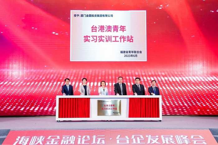 论坛上,金圆集团“台港澳青年实习实训工作站”揭牌成立。福建省委常委、常务副省长郭宁宁,全国青联副主席陈小艳,国台办经济局局长张世宏,共青团福建省委书记李腾,厦门市委常委、常务副市长黄晓舟,金圆集团党委书记、董事长檀庄龙共同为“台港澳青年实习实训工作站”揭牌。