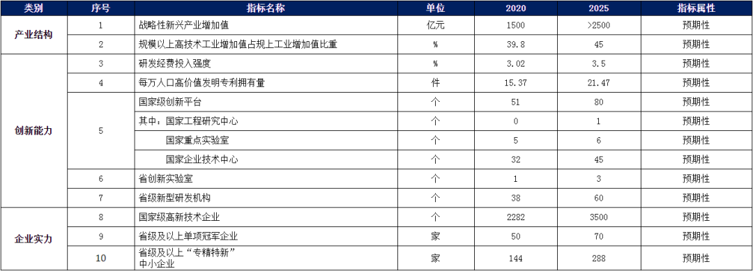 ——创新能力显著增强,产业创新水平取得新跃升。争创国家实验室、国家工程研究中心、国家重点实验室、省创新实验室等高能级创新平台,集聚一批高水平科研院所和新型研发机构,突破一批产业关键核心技术、前沿引领技术和颠覆性技术,全市国家级创新平台超过80家,国家工程研究中心取得突破,新增1家国家重点实验室,省级新型研发机构达到60家,全社会研发经费投入强度达到3.5%,每万人口高价值发明专利拥有量超过20件。